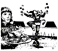 "Let's got to the banquet," Bivotar decides. "I'm pretty hungry." "Always found them to be noisy affairs," Syovar comments, "but if that's what you want..." He leads them into the banquet hall, a huge room whose far wall is a tremendous mirror, and announces them. Most of the guests recognize Bivotar and Juranda from their previous visits to Zork, and they are greeted heartily. Great platters of pheasant and wiled boar are accompanied by an amazing variety of fresh breads, salads, and vegetables. Syovar performs several impressie magic tricks, including levitating the entire table. The jester, Perilon, performs some amusing skits. For dessert, the waiters bring out enormous trays heaped with exotic chocolates, and the finest fruits in season. After the meal, the play begins, featuring a troupe of traveling actors. The play is fairly interesting, being about an aged wizard, exiled from his homeland, who has begun to lose his powers and amuses himself by harassing passing adventurers. Finally, Bivotar and Juranda are escorted to the luxurious guest rooms of the castle. The following morning, Juranda whispers to Bivotar, "You know, I've been feeling a little guilty. Samovar really seemed to want to spend some time alone with us." "I've been thinking the same thing, Juran. Let's ask Syovar if we can do that today." |