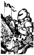 "I want to go to the banquet," states Bivotar. "I'd like to see the crafts fair," Juranda argues. They compromise on the jousting finals and tell Syovar of their decision. "Always thought jousting was pretty barbaric myself," Syovar comments. He accompanies them out to the meadow beyond the castle moat. Large grandstands have been erected around the jousting area. Thousands of people from the surrounding towns fill the stands. Knights, their armor gleaming in the noontime sun, parade about on horseback. Brighly-colored banners flap in the breeze. Syovar leads them to seats in the royal box as the tournament begins. The jousts are fierce and exciting, and the crowds cheer loudly. Elves wind through the stands, selling sweetmeats and rare fruits from far-off lands. After the tournament is over, and Syovar has awarded ribbons to the winners, fires are lit and a gigantic barbeque begins. The smell of roasting steer fills the air. Wine and hearty ale flows freely. The celebration lasts long after nightfall. The next morning, after a restful sleep, Syovar meets the two adventurers at breakfast. Bivotar glances at Juranda and then says to Syovar, "We were thinking last night, Juranda and I, that maybe, maybe we could hear your stories today?" "Yes," Juranda adds, "we should've done it yesterday-I don't know why we decided to go to those jousts instead." |